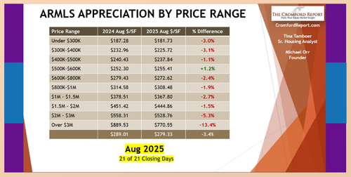 For the monthly period ending September 15, we are currently recording a sales $/SF of $284.42 averaged for all areas and types across the ARMLS database. This is down just 3 cents, or 0.01% from the $284.45.(Basically a total snooze-fest.)